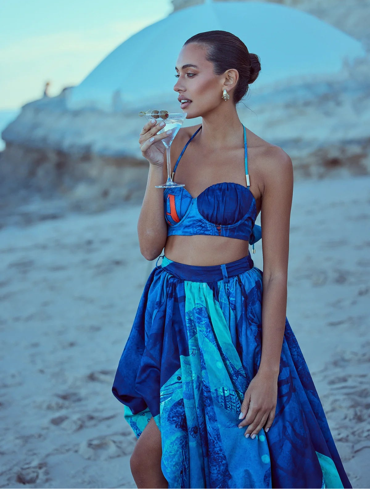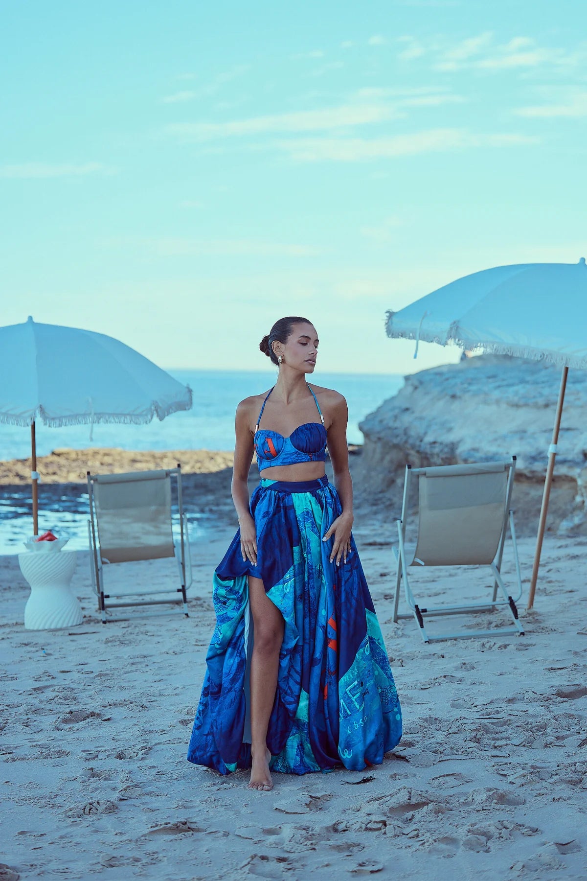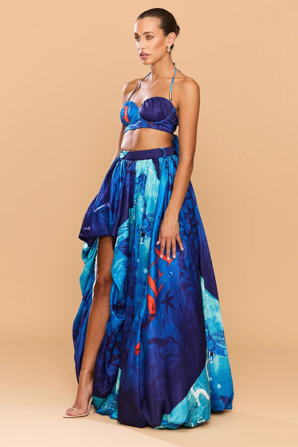 Turn heads in the Arielle Halter Crop Top, a statement piece inspired by the ocean’s vibrant hues. This halter-style top features a sculpted fit with a flattering sweetheart neckline and adjustable back ties for the perfect custom fit. The Sea Print design blends deep blues and aqua tones with bold coral accents. Pair with the matching Melody Bubble Skirt for the ultimate set.