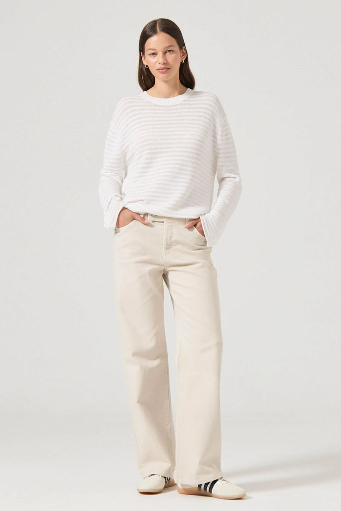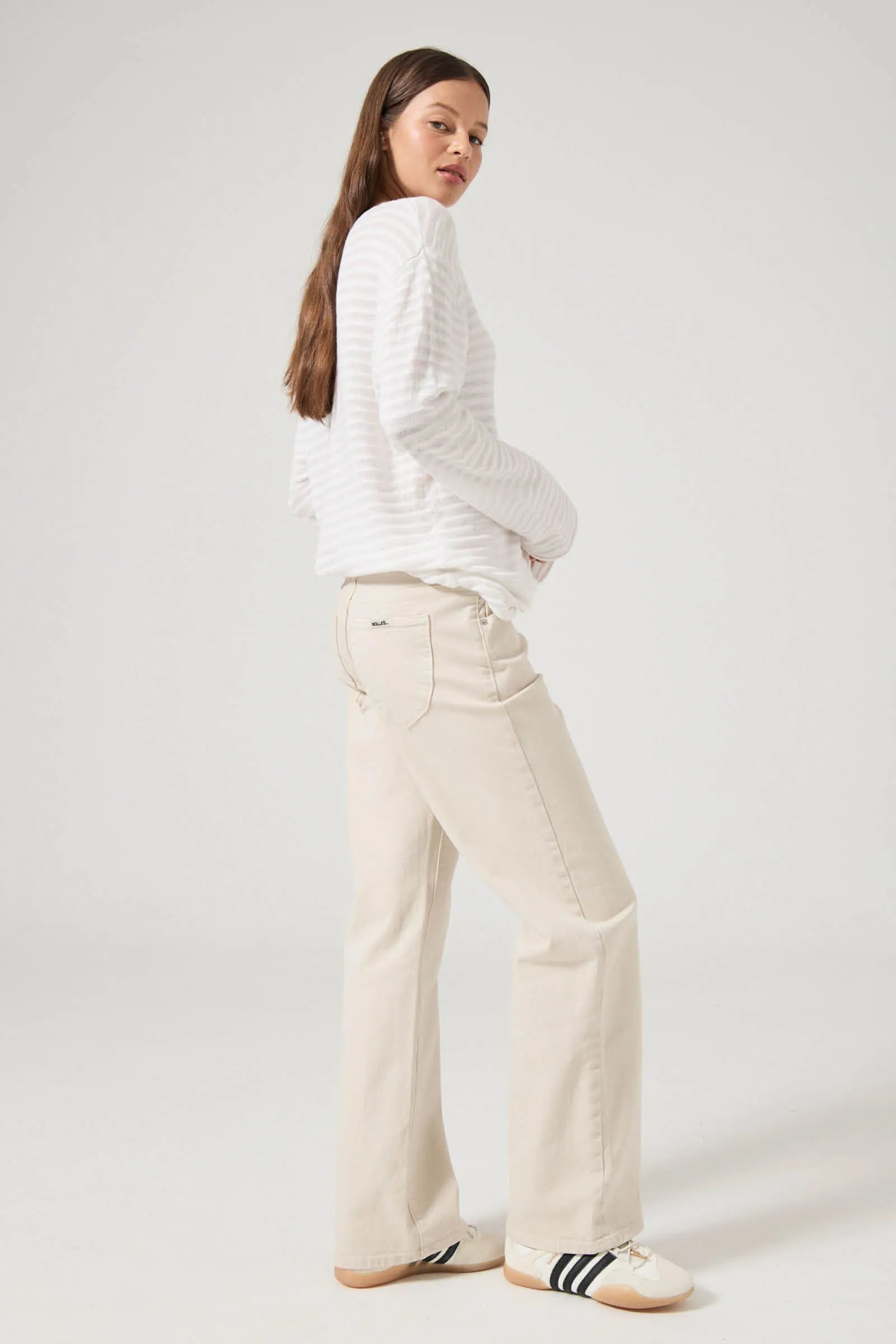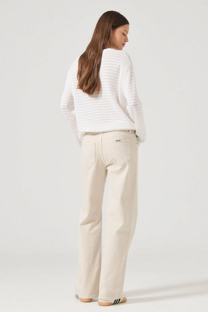 • Low rise fitted jean with relaxed straight leg
