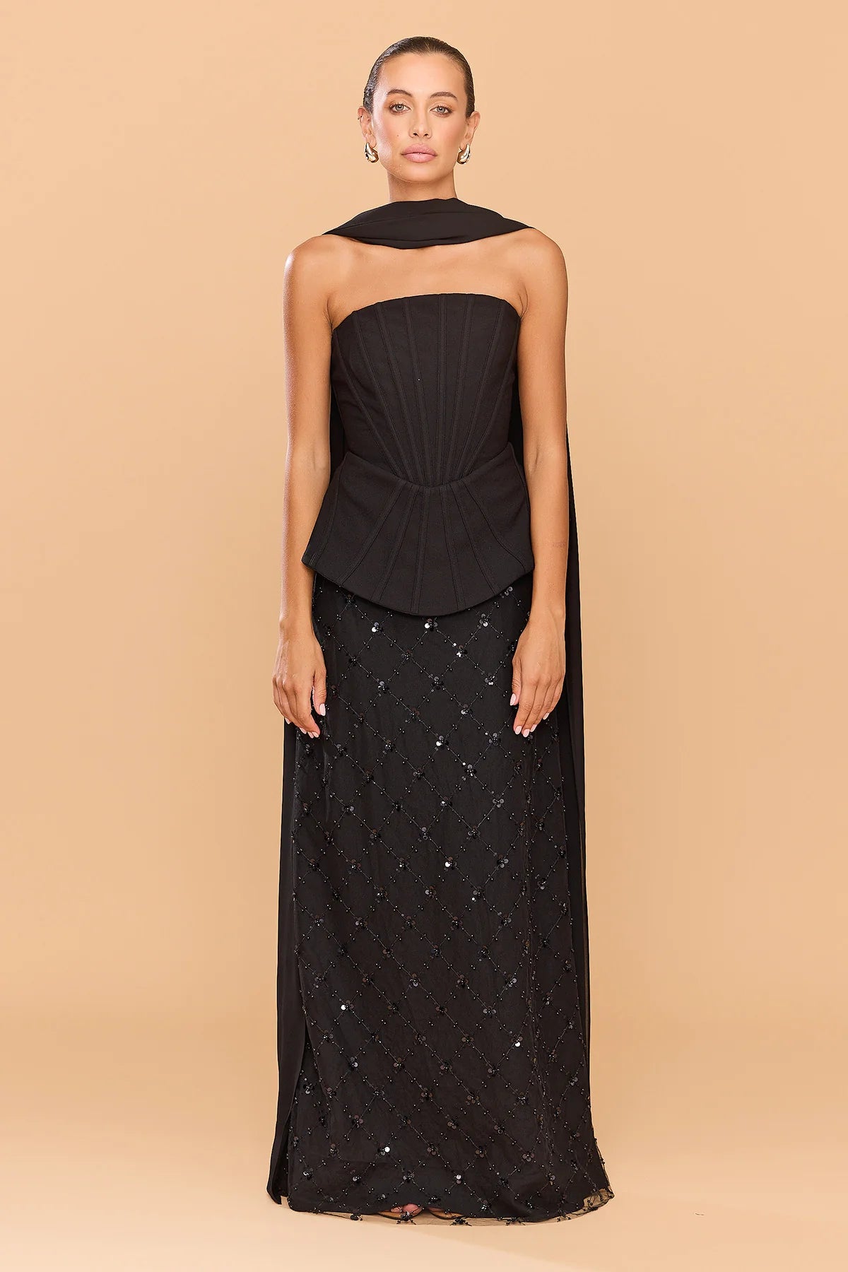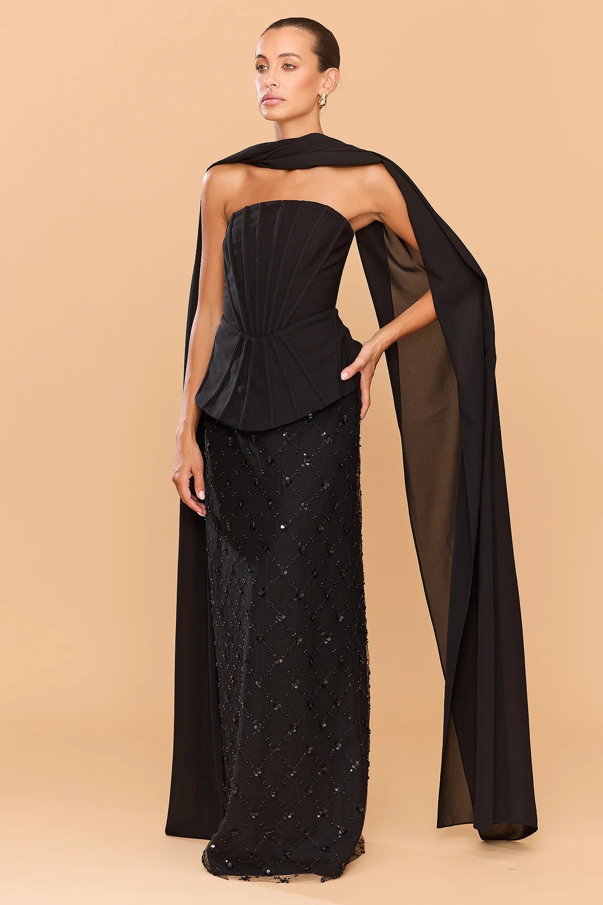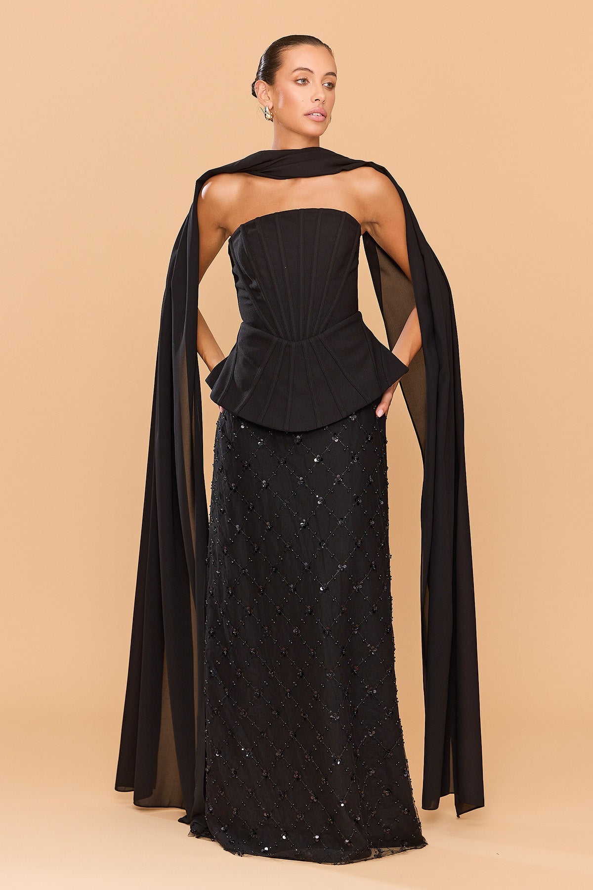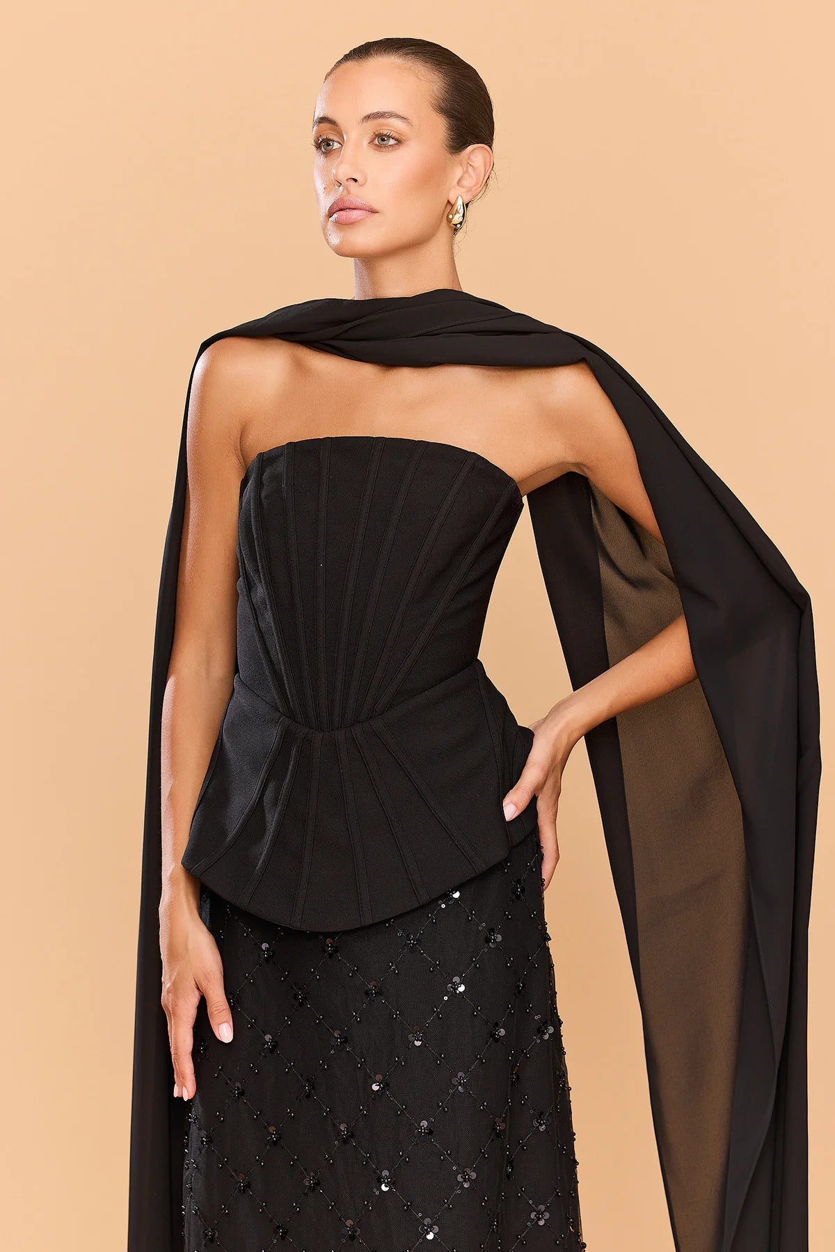 The Cleo Top is a sculptural statement of contemporary elegance. Designed with exposed directional boning, it artfully contours the body. The waist seam flows into a subtle peplum-style hem, accentuating the waistline and adding architectural dimension to the design. Includes a detachable neck scarf, this piece offers a sophisticated touch of drama - draping effortlessly over the shoulders or styled as a wrap for versatile evening glamour. Pair with the matching Amethyst Skirt.