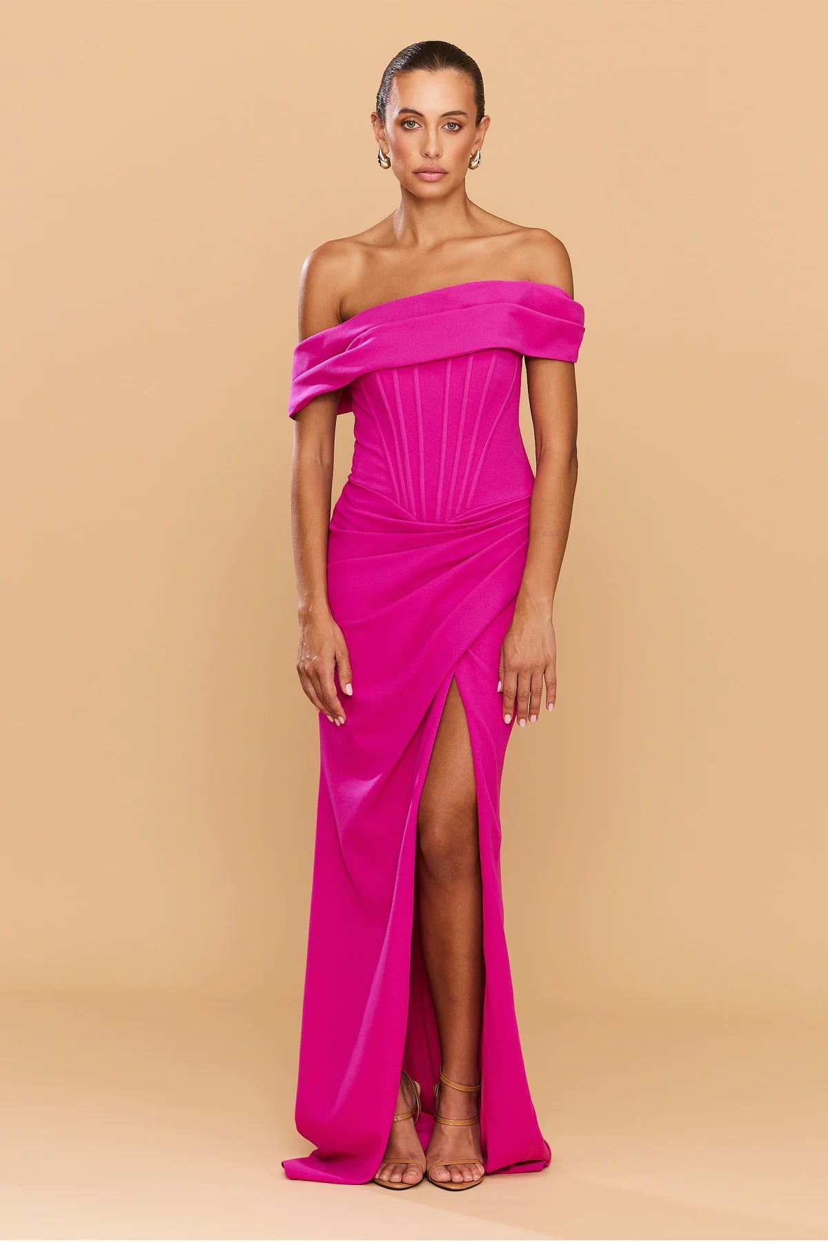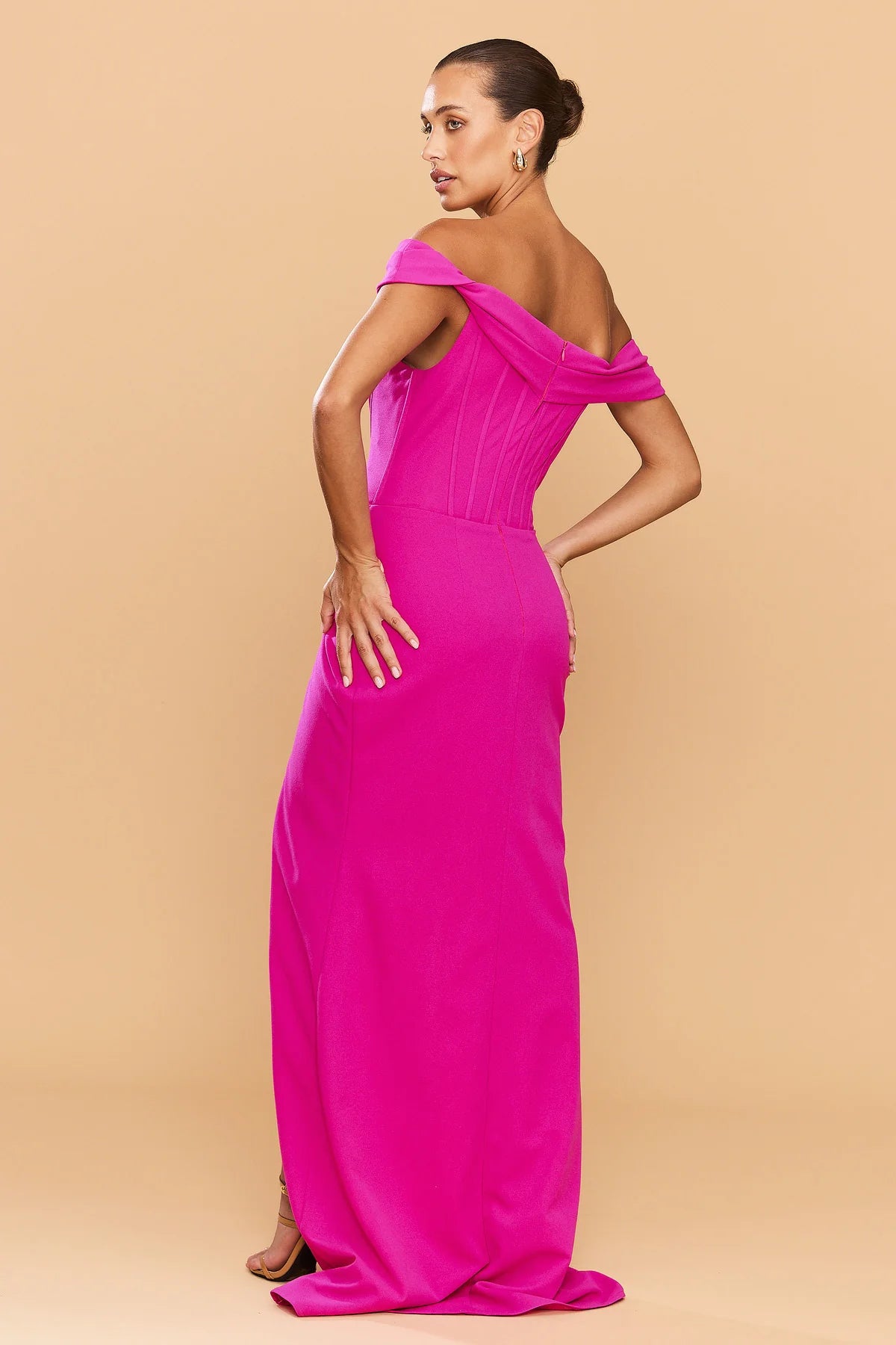 Elevate your evening-wear with the Sapphire Bonded Crepe Stretch Gown - a sculptural masterpiece designed to celebrate the female form. Cut from our signature premium bonded crepe with refined stretch, this striking magenta hue radiates confidence and modern sophistication. Designed to flatter and empower, it features a structured boned bodice, an elegant off-the-shoulder neckline and artful waist draping.
