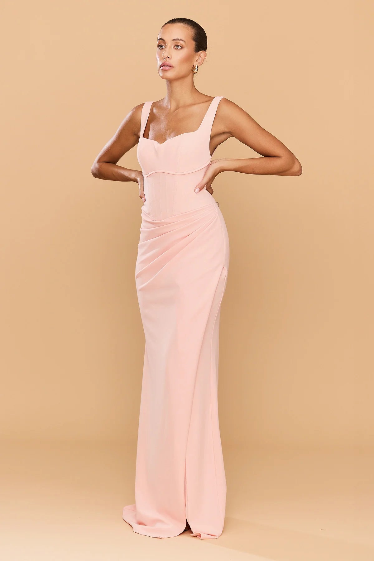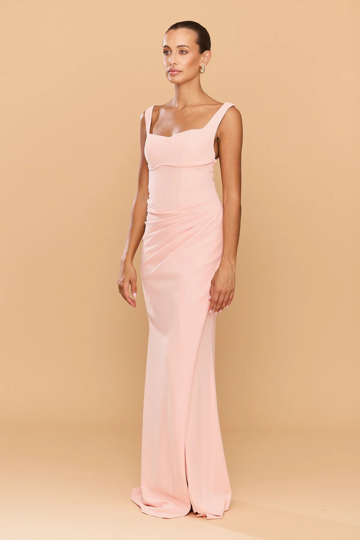 Step into elegance with the Elena Gown designed to sculpt and accentuate the female form. The full-length gown exudes timeless sophistication, featuring a structured bodice with a 90's inspired square neckline and a curved under bust pipping detail. The draping cascades gracefully along the waist, leading to a cross over split that can be worn either closed or open. Made from our premium stretch bonded crepe fabric, the Elena Gown combines comfort with style.
