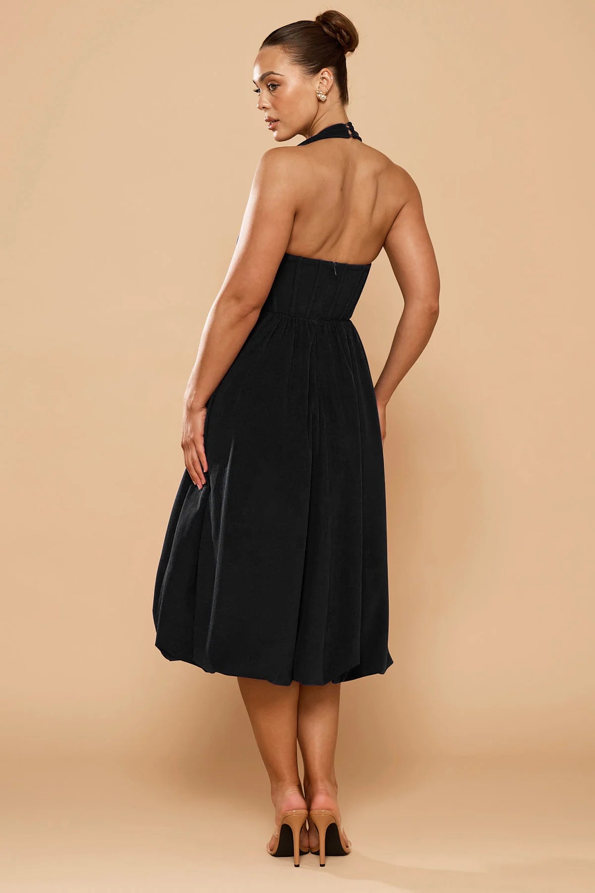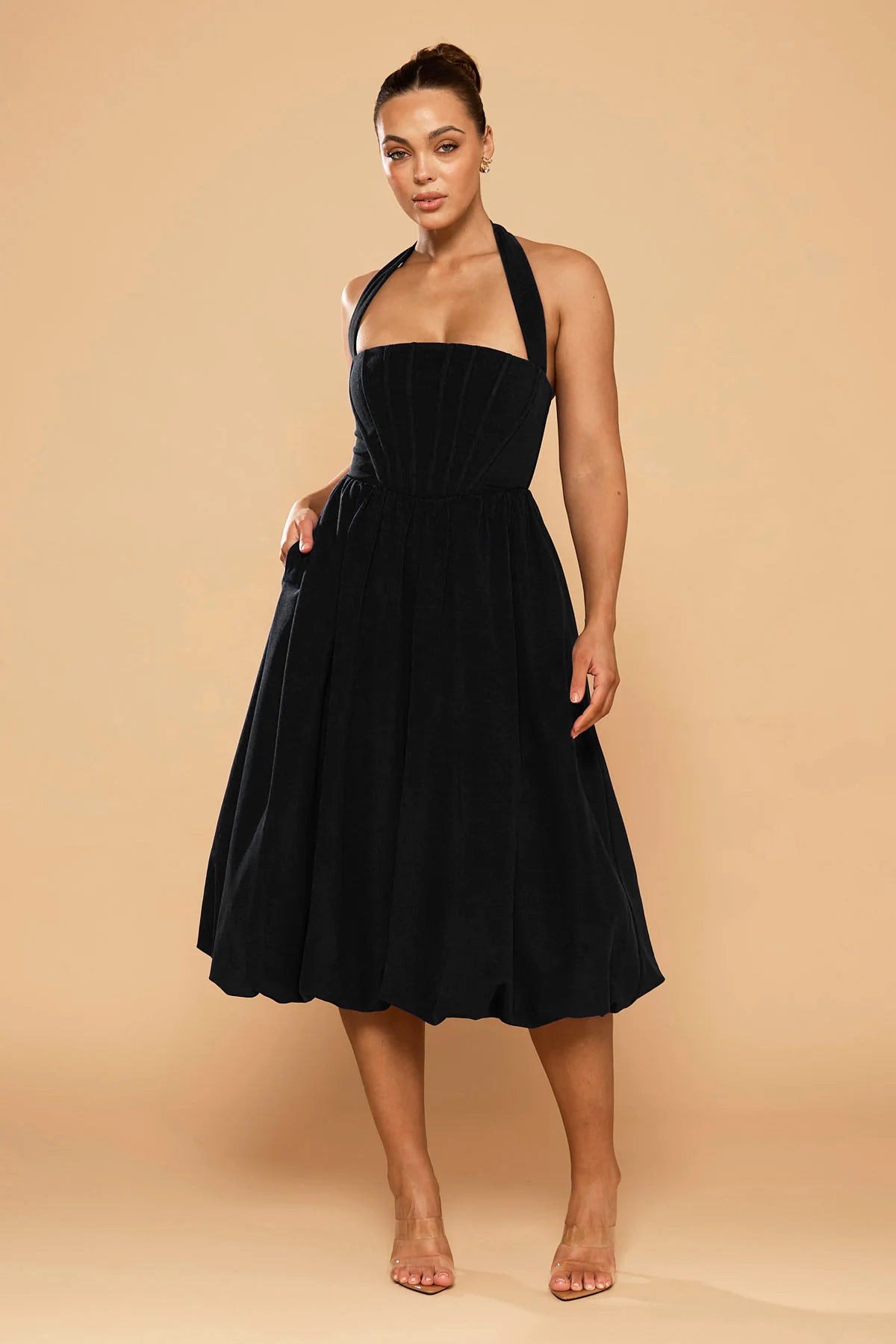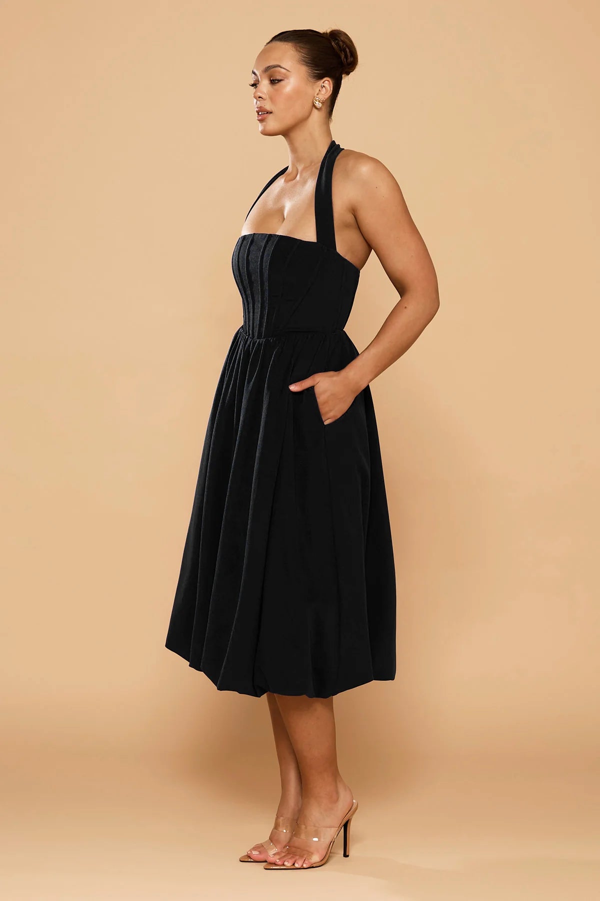 Chic and effortlessly feminine, the Sofia Halter Bubble Midi Dress brings a playful twist to classic elegance. Crafted in our signature bonded stretch crepe, this dress features a structured exposed boned bodice, halter straps, and side pockets. The bubble hem adds volume and movement, creating a striking silhouette that balances structure and softness.