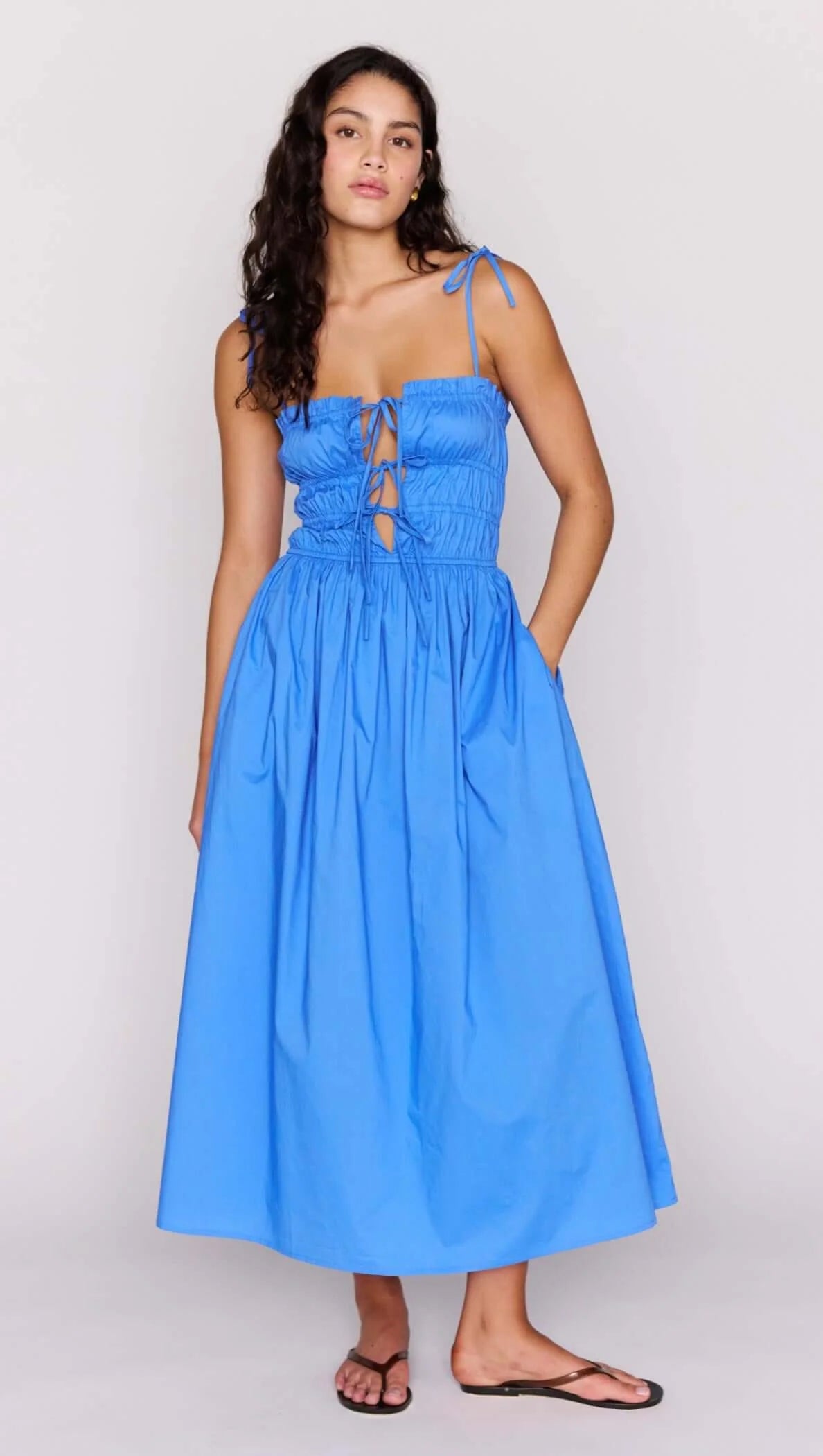 The Liana Blue Cotton Tie Detail Midi Dress is your go-to summer midi dress with a playful, feminine edge. Crafted from crisp cotton poplin, this style features a flattering shirred bodice with adjustable front tie detailing, offering both comfort and shape.