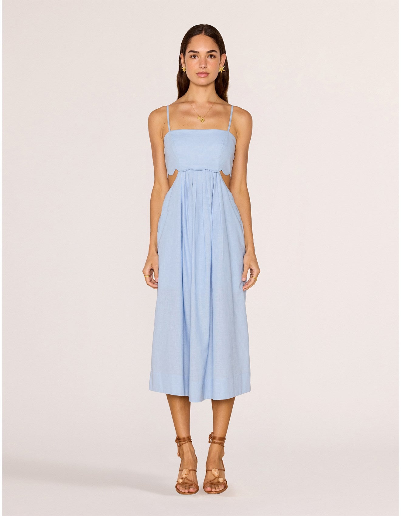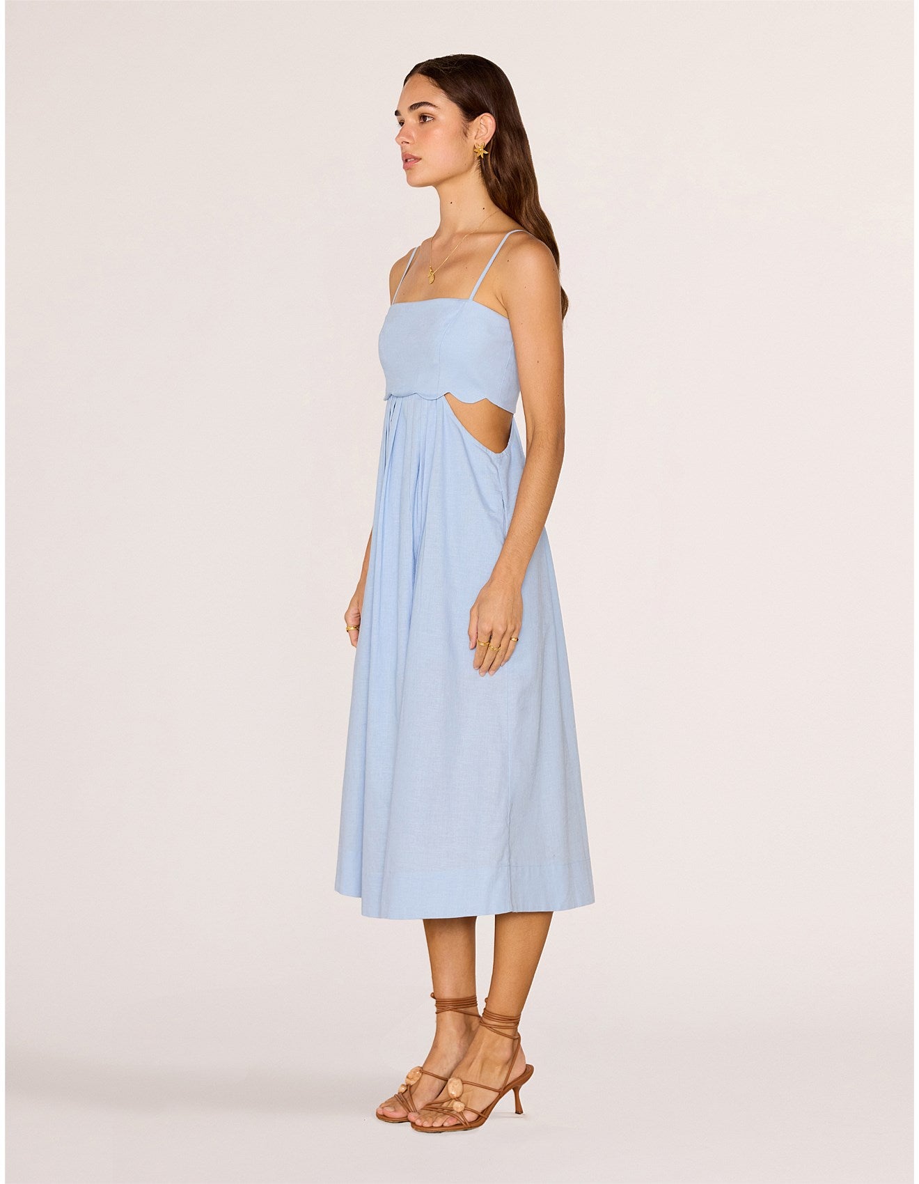 Breezy and beautifully feminine, the Marivelle Scallop Midi Dress is the perfect look for long summer lunches and warm evenings by the sea. Crafted from a soft cotton-linen blend, it features a flattering fitted bodice, subtle cut-out sides, and delicate scalloped detailing for an elevated finish.