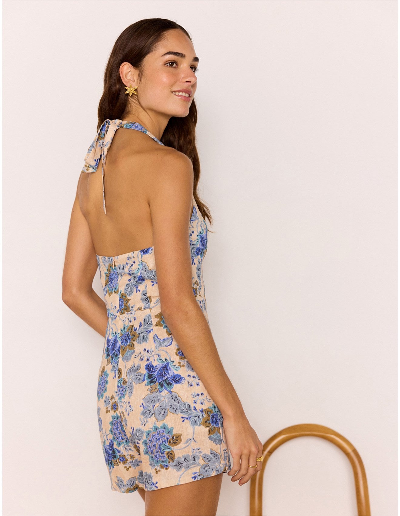 Say hello to your summer statement piece - the Zina Halter Playsuit. Featuring a soft linen-viscose blend and a dreamy vintage floral print, this halter-neck style ties at the neck and wraps around the waist for a flattering, feminine fit. Effortless from day to night, it’s perfect for long lunches, summer getaways, or balmy nights out.