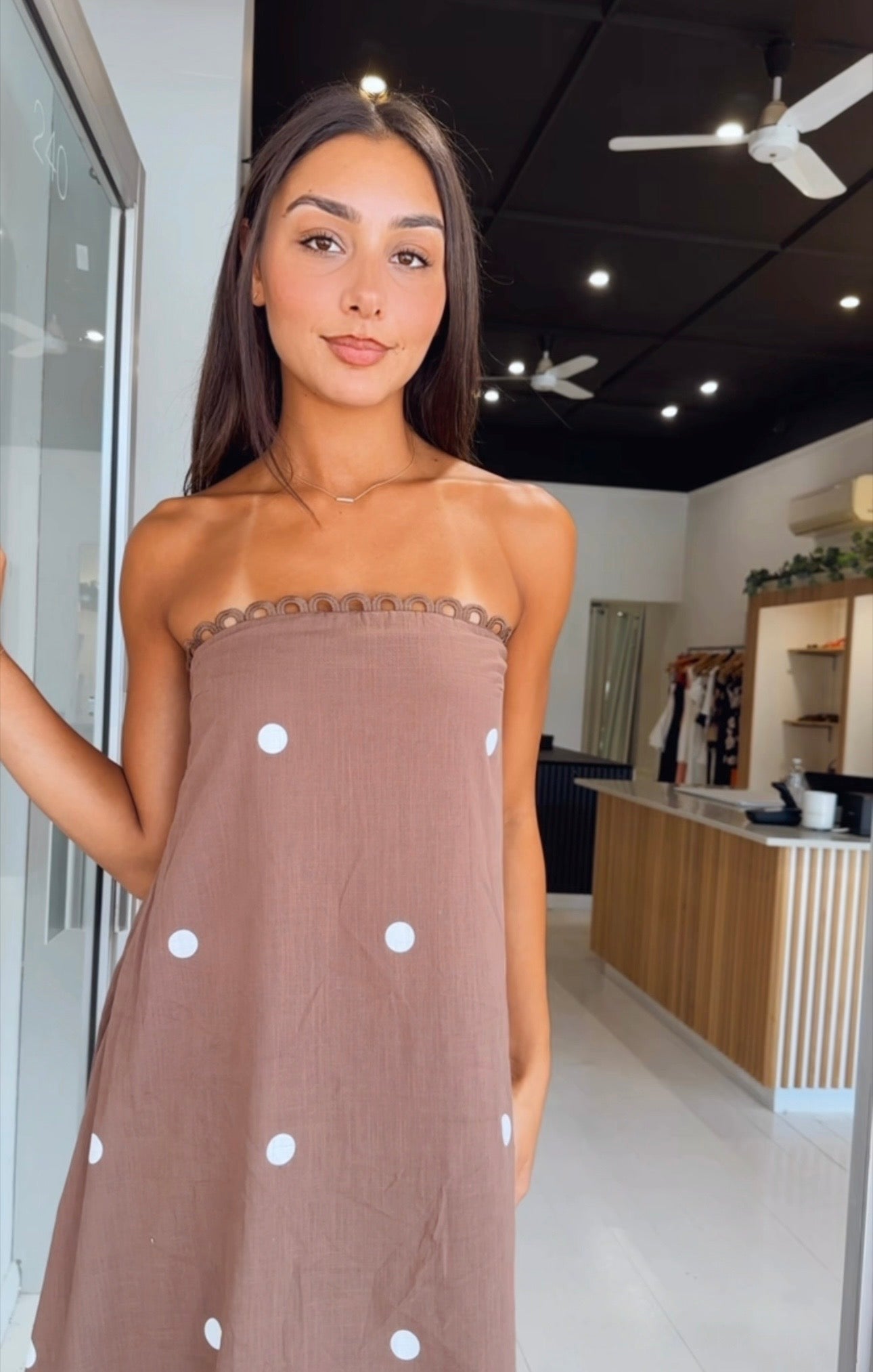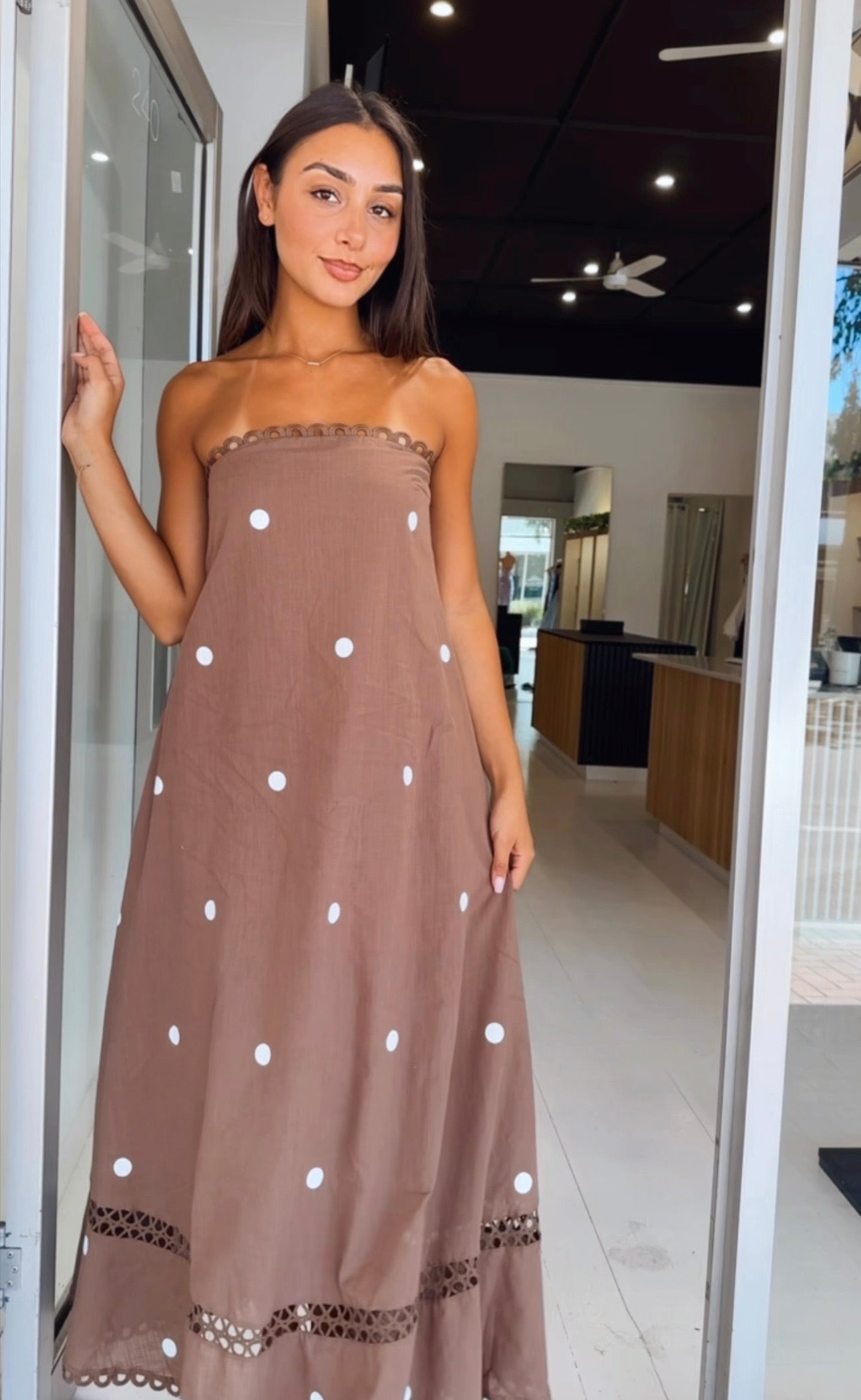 Effortlessly elegant, the Jenna Polka Maxi captures the essence of carefree summer style. This strapless design features delicate scalloped trip detailing and a refined border trim that adds understated sophistication. The flowing maxi silhouette embraces a relaxed boho aesthetic, perfect for warm-weather occasions where comfort meets timeless grace. A versatile piece that transitions seamlessly from day to evening.