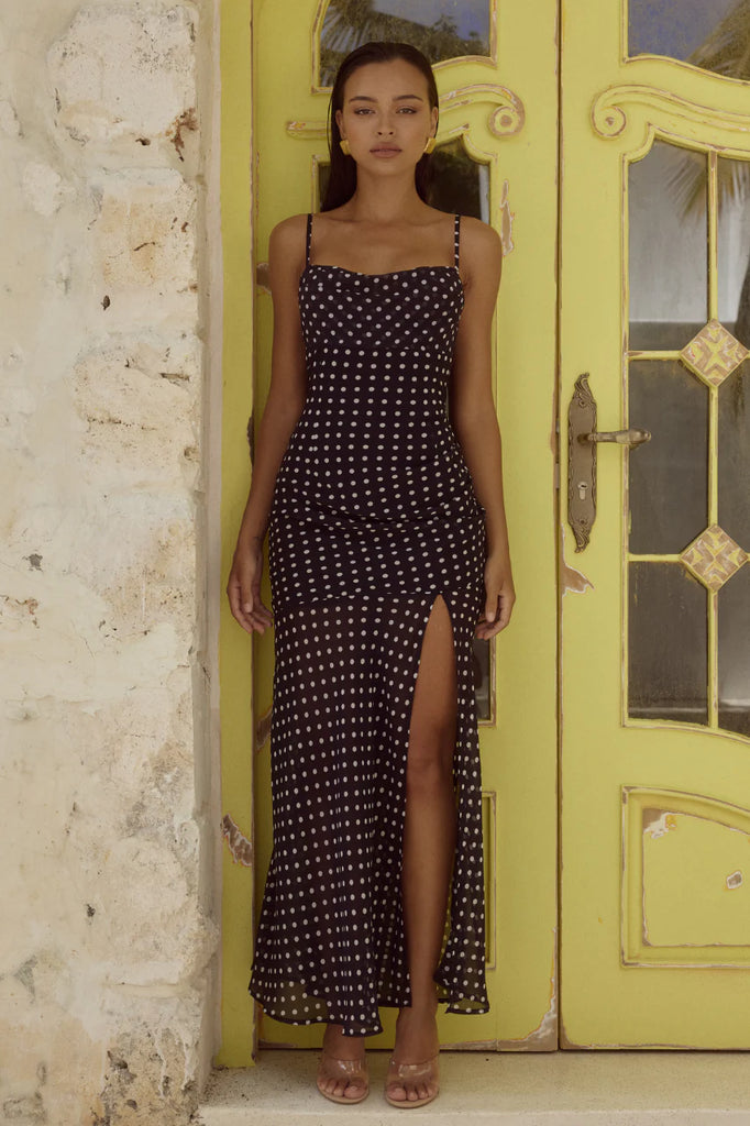 With a subtle cowl neck and side split, our Kyleah Maxi Dress is effortlessly sultry.
