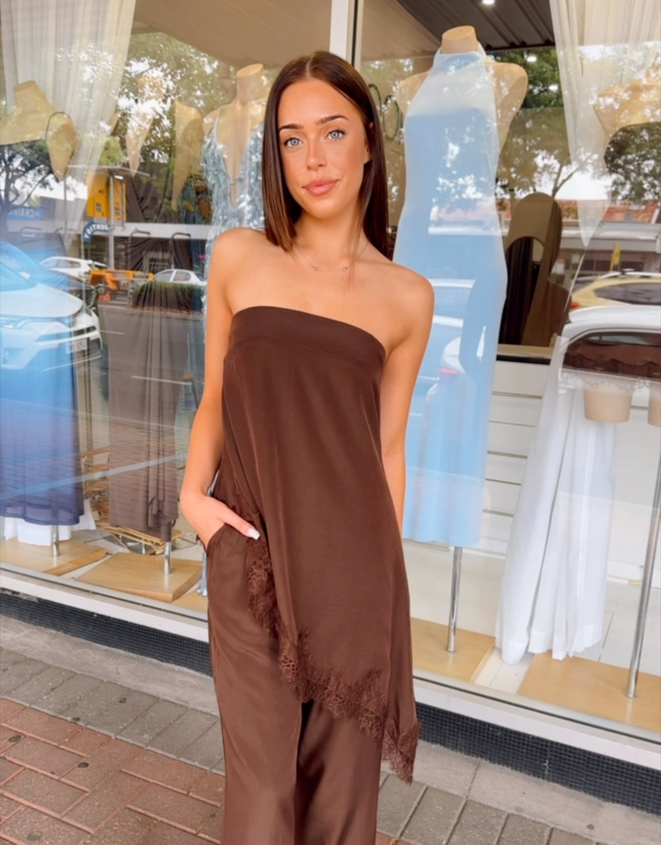 Introducing Mia—the strapless set that's equal parts chic and flirty. This two-piece features a sleek strapless top paired with matching pants, both finished with delicate lace trim for that extra touch of elegance. Perfect for date night, special occasions, or whenever you want to feel effortlessly confident. The strapless silhouette offers versatility, while the lace detailing adds a hint of romance. Slip into Mia and let your style do the talking.