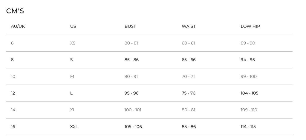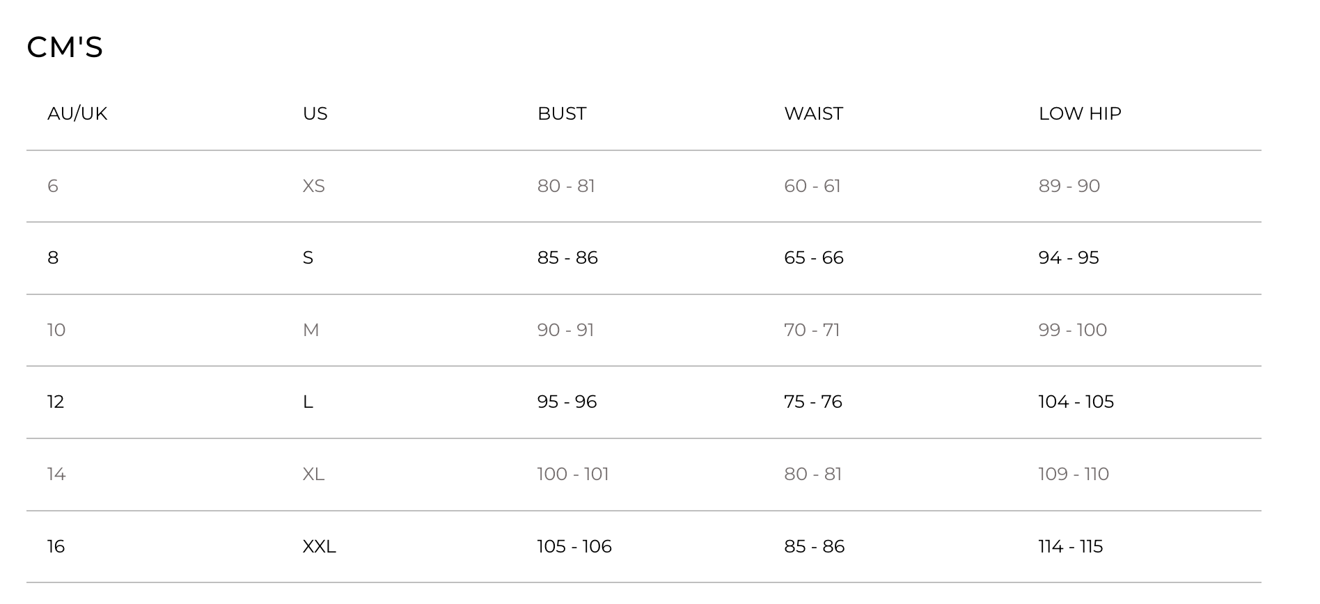 Model measurements: Bust: 79cm, Waist: 61cm, Hips: 91cm