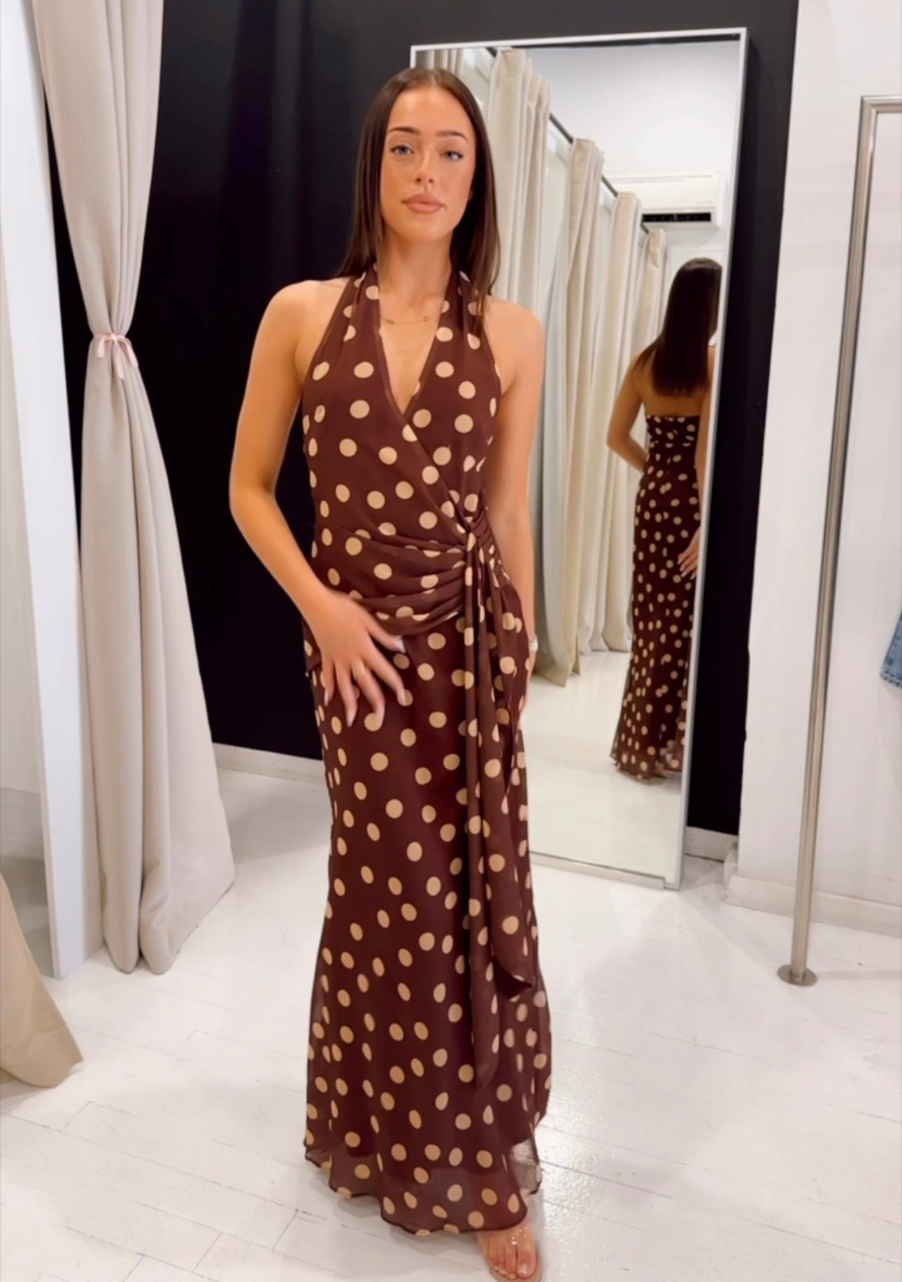 This halter-neck maxi dress is your ticket to effortless style—blending vintage-inspired polka dots with contemporary elegance. Tie it your way with the adjustable side detail and wrap-front cut, creating a custom silhouette that feels just right. The lightweight chiffon paired with smooth rayon lining ensures you'll stay comfortable and confident, whether you're twirling at a garden party or keeping it casual. Undeniably feminine, endlessly wearable, and bursting with personality.