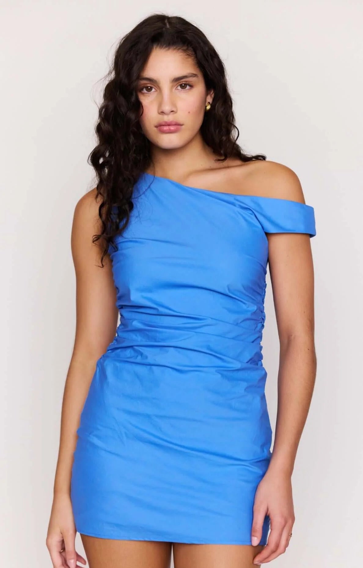 Made to stand out. The Liana Blue One-Shoulder Fitted Mini Dress features soft ruching through the body for a flattering, figure-hugging fit with an elevated edge. Crafted in crisp cotton with a smooth lining, it’s lightweight, comfortable and perfect for nights out, parties and summer events.