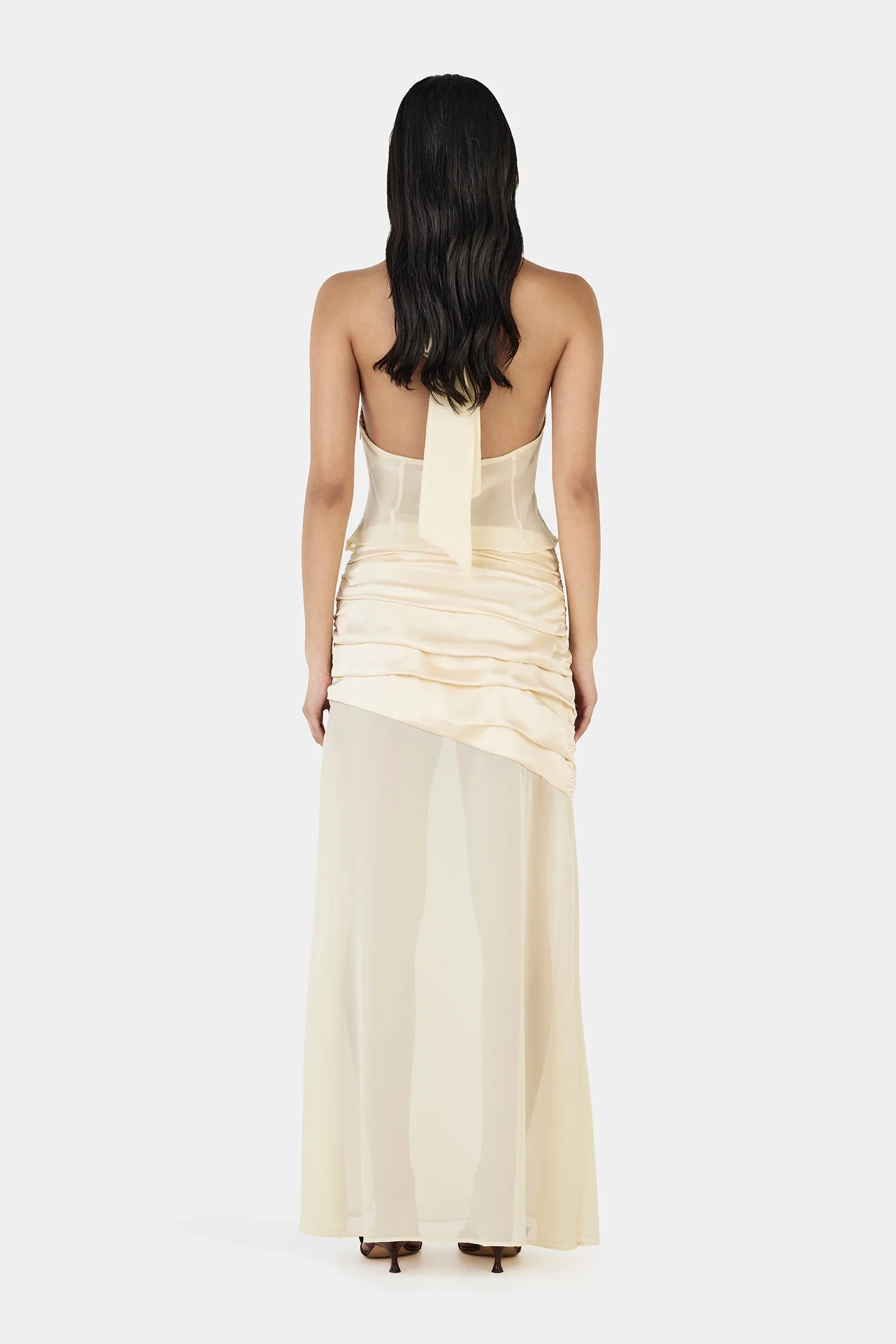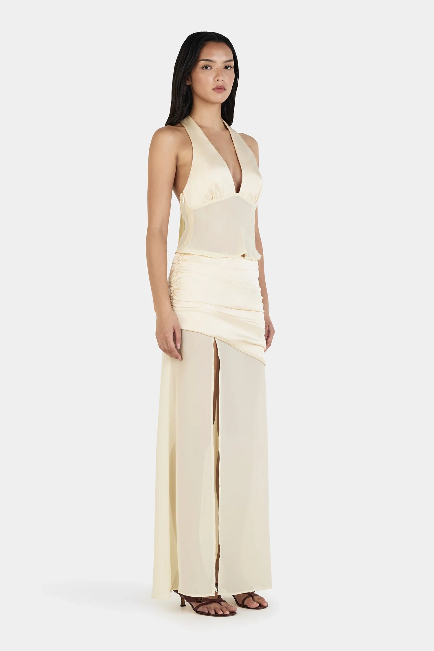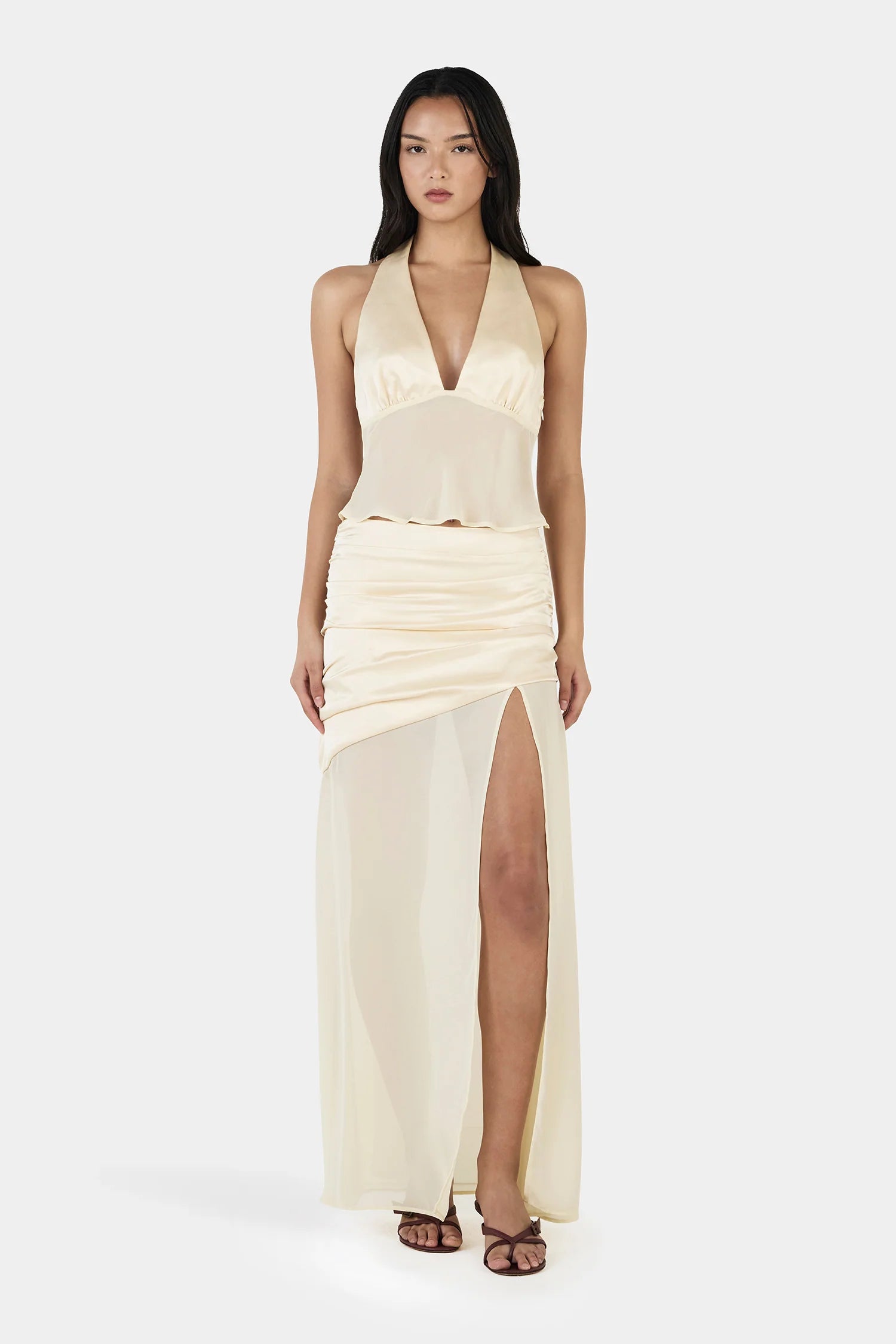 The Delilah Scarf Top is crafted from a contrasting soft satin and sheer georgette. Lined bust cups and an unlined sheer bodice with neck ties create a flattering fit with elevated detailing. Finished with an invisible side seam zipper for a sleek silhouette