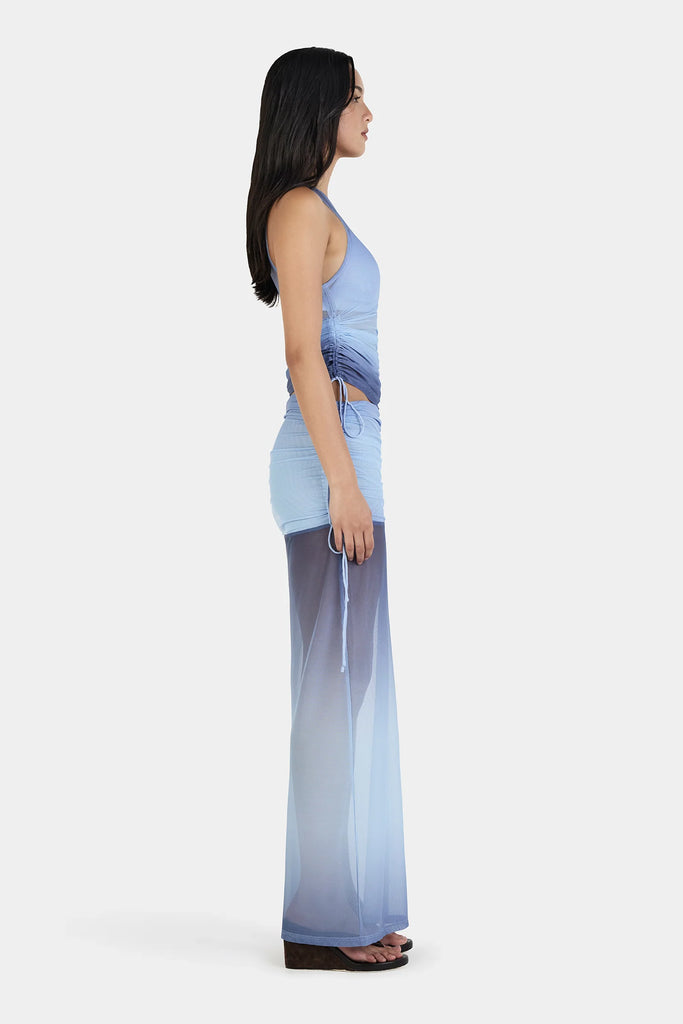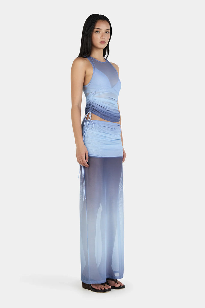 The Heather Maxi Skirt is a low-rise mesh maxi skirt with adjustable ties that create a gathering at the side seams for a flattering shape. The skirt has a ruched hip panel that is fully lined for coverage while the rest of the skirt is sheer. Pair with the matching Jacinta Top for a complete look to mix and match.