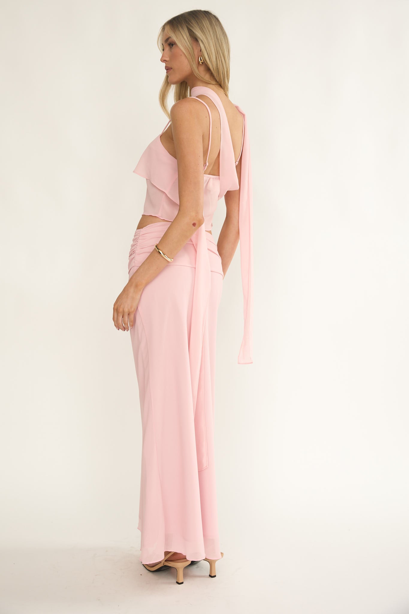 The Evie Frill Set combines effortless elegance with contemporary style. This two-piece ensemble features a loose-fitting frill top with delicate tie detailing, paired with a fluted hipster skirt that flatters the silhouette. Perfect for those seeking a refined, put-together look that transitions seamlessly from day to evening. The relaxed fit ensures comfort without compromising on sophistication, making it an essential addition to any discerning wardrobe.