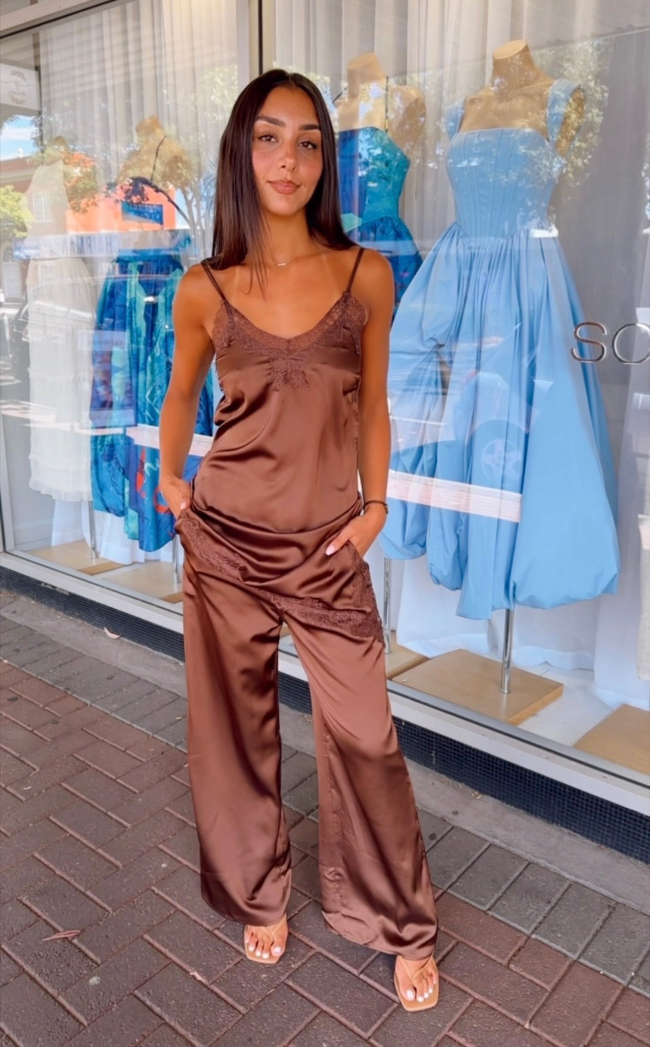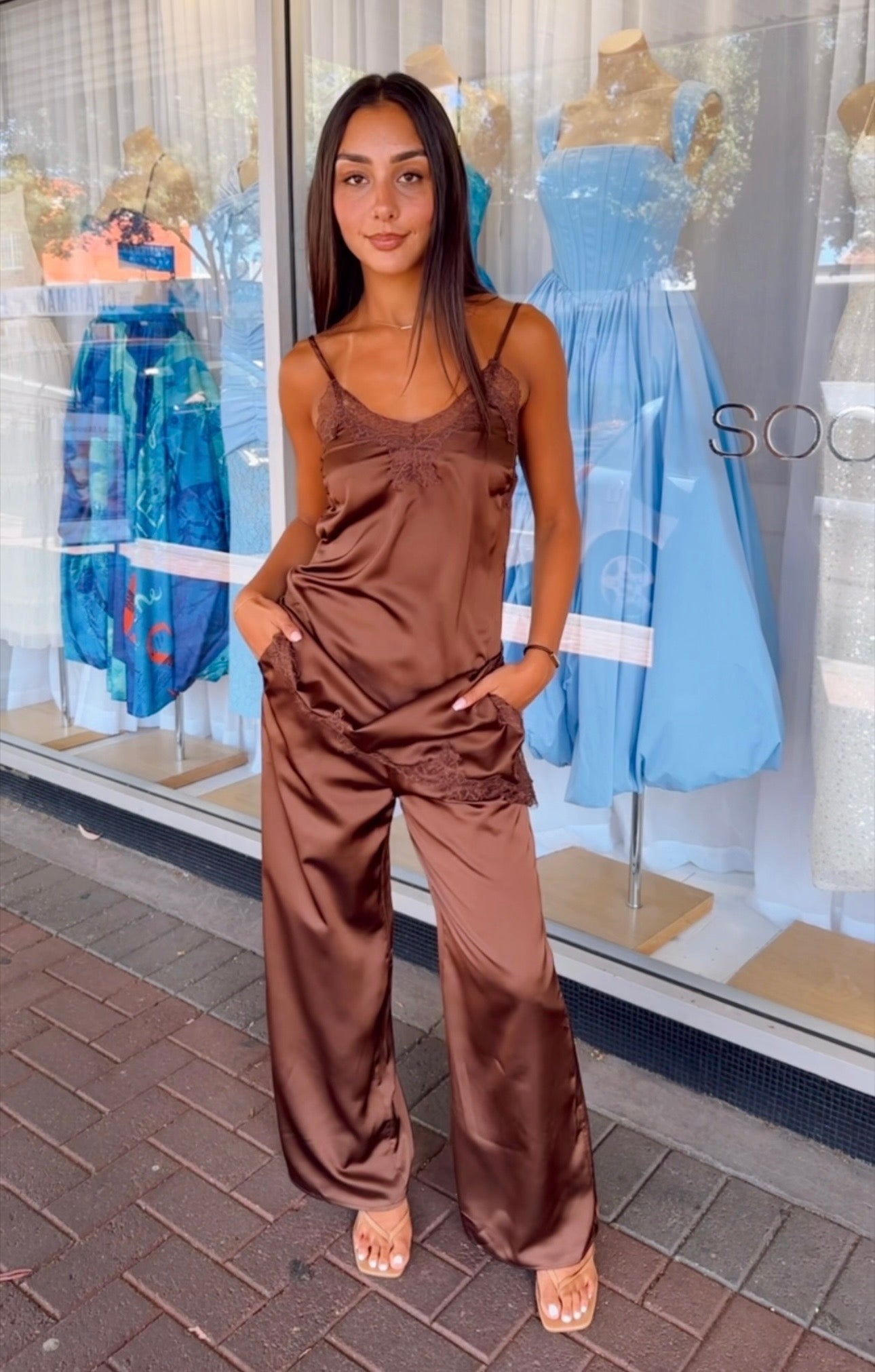 Effortless style meets on-trend vibes with the Camille Lace Pant Set. The singlet features an asymmetrical hem with delicate lace trim insert and adjustable straps for the perfect fit, while the elastic-waist pants offer comfort and ease. Dress it up or down—pair with slides for those scorching summer days and you're ready to turn heads wherever you go.