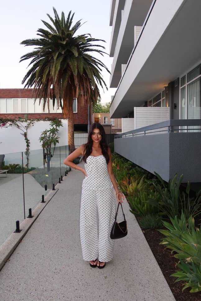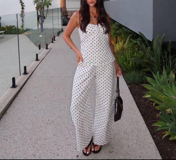 The Carly Polka Pants Set is your go-to for effortless chic vibes. These structured pants feature a reinforced waistband for a flattering fit, complete with a functional zipper and smooth lining for all-day comfort. The extra-long leg creates a sleek silhouette that works beautifully with the matching strapless top. Whether you're dressing up for a night out or keeping it casual, this set delivers polished style without the fuss. Perfect for anyone who wants to look put-together without overthinking it.
