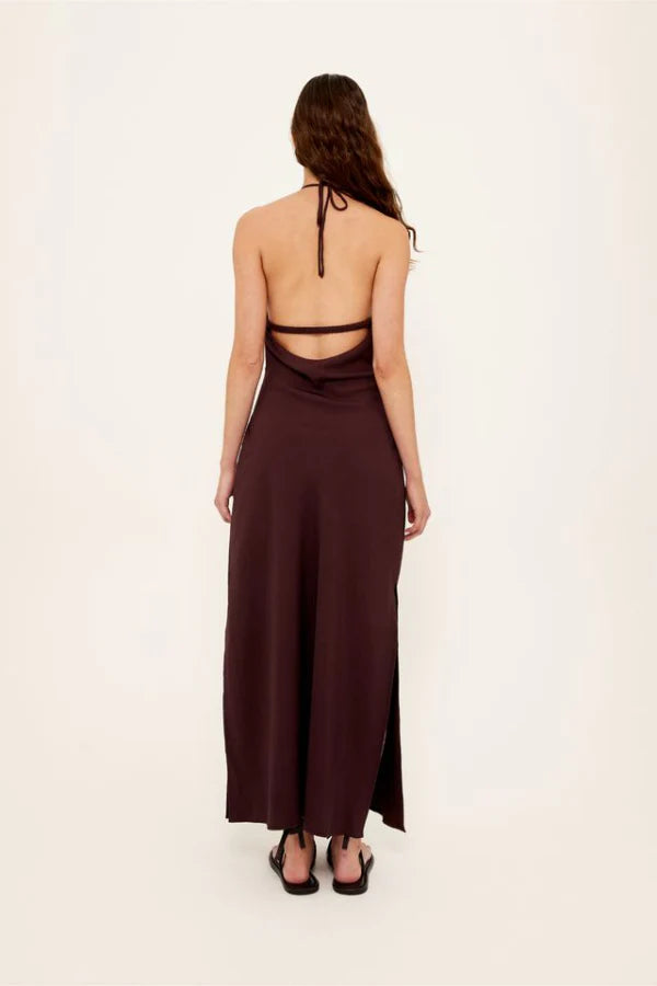 The Elira Halter Midi Dress in a rich chocolate hue features a stylish tie front, a draped cowled back, and an open design secured with an elastic strap for a refined yet comfortable fit.