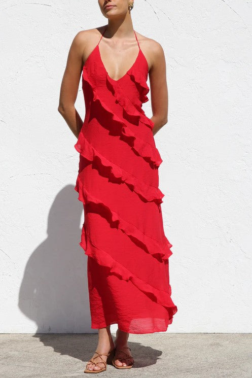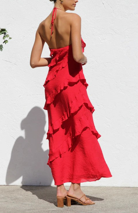 The Valeria Dress in striking red combines timeless elegance with contemporary flair. This sophisticated piece features a flattering halter neckline and delicate ruffled detailing that adds movement and dimension to your silhouette. Perfect for those who appreciate refined style with a touch of playful texture, this dress transitions effortlessly from special occasions to elevated everyday wear. A wardrobe essential that delivers both comfort and undeniable presence.